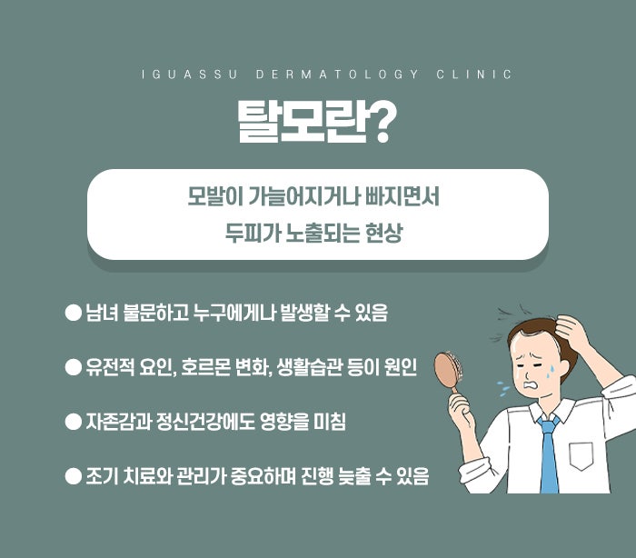 아침에 머리를 감고 나서 빠진 머리카락을 볼 때마다, 빗을 한 번만 넘겨도 머리카락이 숭숭 빠지는 느낌이 들 때마다 ‘혹시 나 정말 탈모가 시작된 걸까.’ 하는 불안함이 마음 한쪽에 계속 맴도셨을 것입니다. 구리탈모는 말 그대로 머리카락의 굵기와 밀도가 줄어들면서 눈에 띄게 숱이 감소하는 상태를 뜻합니다. 어느 정도의 머리카락 빠짐은 자연스러운 생리 현상이지만, 하루에 빠지는 양이 눈에 띄게 많아지거나, 특정 부위가 집중적으로 비어 보이고, 이전보다 머리카락이 확실히 가늘어졌다면 탈모를 의심해 볼 수 있습니다. 탈모는 원인과 양상에 따라 여러 종류로 나뉘는데, 많은 분들이 겪는 남성형·여성형 탈모는 유전적 소인과 남성 호르몬이 깊게 관여하는 것으로 알려져 있습니다. 이 경우 이마 양 옆이 점점 뒤로 밀리거나, 정수리 부위부터 숱이 줄어드는 식으로 진행되는 경우가 많습니다.