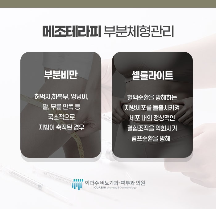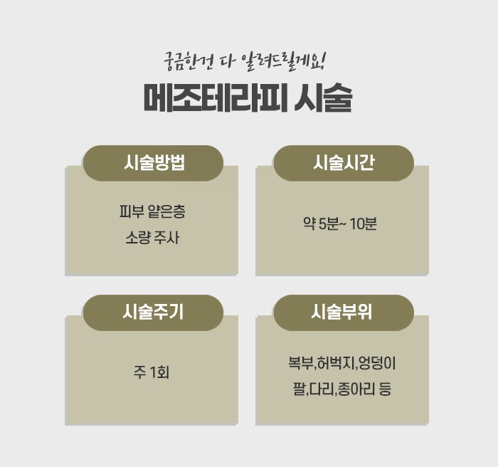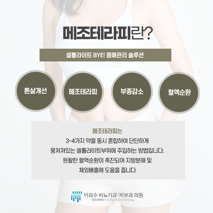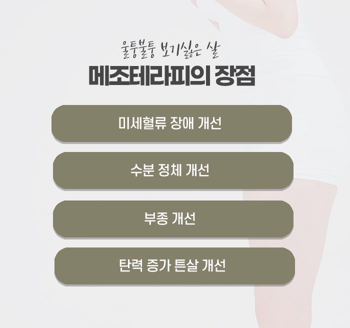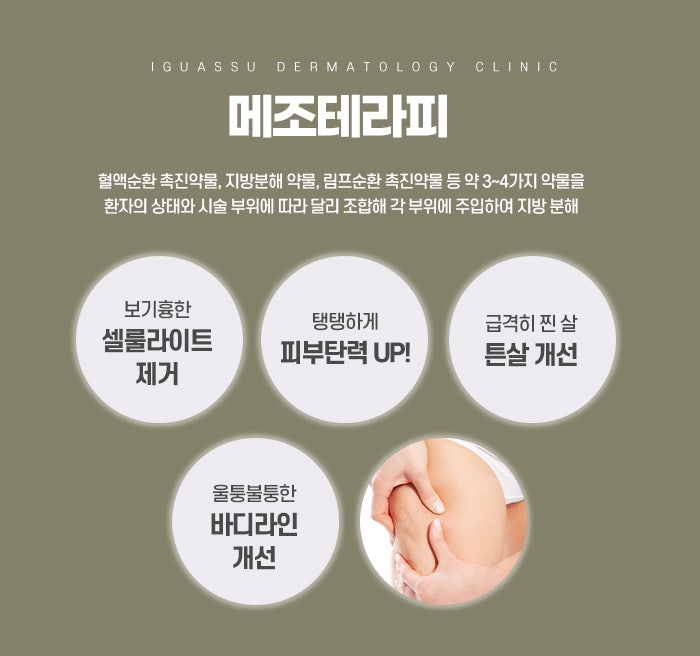 이산화탄소가 들어오면 우리 몸은 그 부위의 농도를 낮추기 위해 산소 공급을 늘리는 방향으로 반응하며, 이 과정에서 미세혈관이 확장되고 순환이 원활해지면서 지방 주변 환경이 조금씩 달라집니다. 복부, 허벅지 안쪽, 팔뚝, 옆구리, 엉덩이처럼 지방이 잘 빠지지 않고 울퉁불퉁해 보이는 부위에 많이 시행되며, 특히 운동과 식단으로는 변화가 부족했던 부위에 관심을 두는 경우가 많습니다. 메조테라피는 지방층에 소량씩 여러 성분을 주입해 지방 대사와 순환을 촉진하도록 돕는 방식입니다. 지방 축적이 잘 일어나는 부위에 직접 접근한다는 특징이 있으며, 병원마다 사용하는 용액의 구성은 다르지만, 지방과 체액 흐름에 관여하는 성분과 순환을 돕는 성분이 포함되는 경우가 많습니다. 주로 허리, 팔뚝, 이중턱, 복부, 허벅지처럼 부분적으로 신경 쓰이는 곳에 적용되며, 운동과 식단 조절을 병행하면서 조금 더 부드러운 라인 변화를 기대하는 경우 선택되는 구리다이어트 시술입니다.