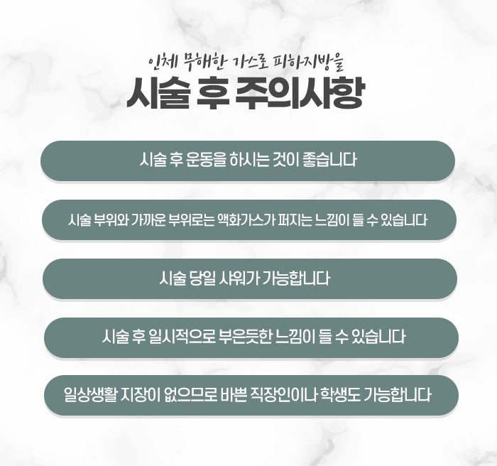 두 방법 모두 바쁜 일상 속에서 시간을 내기 어려운 현대인들에게 적합한 특성을 지니고 있습니다. 별도의 긴 회복 기간이 필요하지 않아 일상생활로 즉시 돌아갈 수 있으며, 소요 시간 또한 짧아 점심시간이나 퇴근 후를 활용하기에도 적절합니다. 또한 가느다란 바늘을 사용하기에 흔적이 크게 남지 않고 자연스러운 변화를 이끌어낼 수 있다는 점이 큰 장점으로 꼽힙니다. 구리다이어트 시술을 받은 이후에는 몇 가지 관리 수칙을 지켜주는 것이 좋습니다. 가스가 주입된 부위나 약물이 들어간 자리가 잘 퍼질 수 있도록 가벼운 산책이나 스트레칭을 병행하면 순환이 더욱 원활해집니다. 물을 평소보다 자주 마셔주는 습관은 대사 산물이 몸 밖으로 원활히 나가는 것을 도와줍니다. 시술 당일에는 무리한 운동이나 고온의 사우나는 피하는 것이 좋으며, 자극을 받은 피부가 진정될 수 있도록 편안한 옷을 입고 휴식을 취하는 것이 바람직합니다.