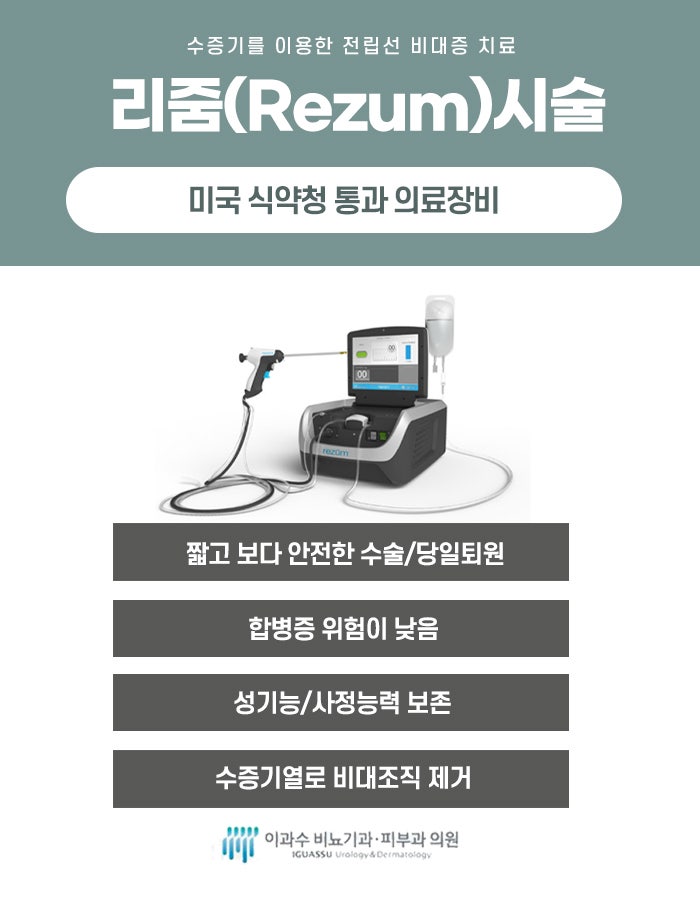 구리비뇨기과 리줌 치료법은 전립선비대증 치료 방법 중 하나입니다. 이 치료법은 증상을 개선하기 위해 전립선 조직을 축소시키는 데 사용됩니다. 리줌 치료는 수증기를 이용한 치료법으로, 전립선에 미세한 수증기 액체를 주입하여 비대해진 전립선 조직을 파괴하는 방법입니다. 이 과정에서 수증기는 전립선 조직에 열을 전달하여 조직을 부드럽게 제거하거나 축소시킵니다. 이 치료는 전립선 비대증 증상을 개선하고, 배뇨의 어려움을 개선하는 데 도움을 줍니다. 수술이 필요 없고, 주사로 치료를 진행할 수 있어 회복 시간이 빠릅니다. 치료 후 몇 주 이내에 증상 개선이 나타나며, 장기적으로 도움이 됩니다.