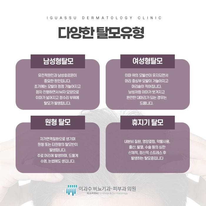 탈모는 원인에 따라 비흉터성 탈모와 흉터성 탈모로 나눌 수 있습니다. 대부분의 일반적인 탈모는 비흉터성 탈모에 속하며, 이 경우 모낭이 살아 있어 치료를 통해 어느 정도 회복이 가능합니다. 반면 흉터성 탈모는 염증이나 외상 등으로 인해 모낭이 영구적으로 손상된 경우로, 이 경우에는 치료가 제한적이며 모발 이식이 필요한 경우도 많습니다. 구리탈모의 진단은 두피 상태를 직접 관찰하고 병력 청취, 가족력 조사, 혈액검사 등을 통해 탈모의 원인을 파악합니다. 필요한 경우 두피 확대 촬영이나 모발 밀도 측정, 모발 당김 검사 등의 방법을 사용해 보다 정밀한 진단을 내립니다. 이러한 진단을 바탕으로 원인에 맞는 치료가 이루어지게 됩니다.