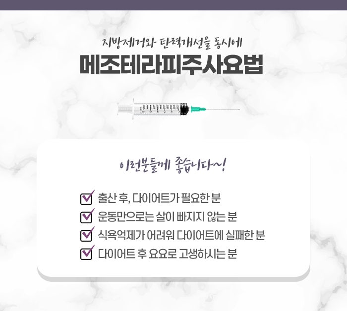 구리다이어트를 하다 보면 누구나 공통적으로 겪는 어려움 중 하나는 특정 부위의 지방이 잘 빠지지 않는다는 점입니다. 특히 복부, 옆구리, 허벅지 안쪽, 팔뚝, 등살과 같이 특정 부위는 체질에 따라 지방이 쉽게 축적되고, 반대로 쉽게 빠지지 않는 경향이 있습니다. 이처럼 특정 부위의 지방을 줄이고 싶은 욕구는 많지만, 일반적인 체중 감량 방법으로는 이러한 부위의 지방을 선택적으로 없앨 수 없습니다. 이럴 때 메조테라피와 카복시테라피는 지방 분포에 직접 작용함으로써 다이어트 과정에서 보다 구체적이고 눈에 띄는 변화를 유도하는 데 큰 도움이 됩니다.
