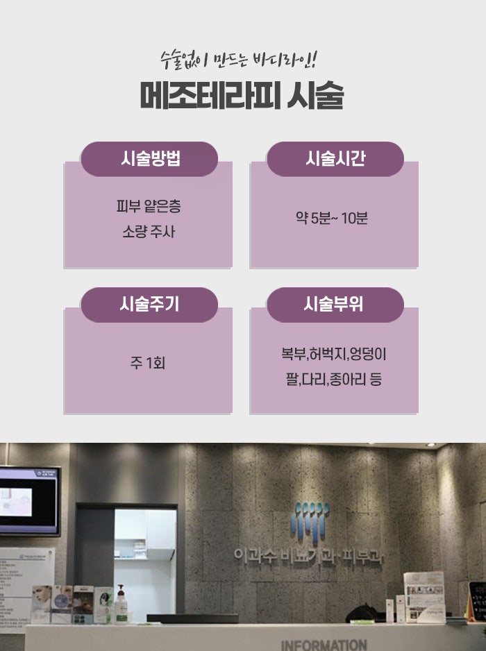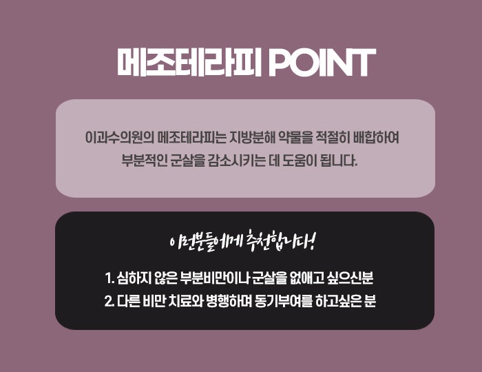 또한 통증이 거의 없어 많은 사람들이 선호하는 방법입니다. 카복시 테라피는 피부 건강을 개선하고, 지방 분해를 촉진하여 구리다이어트를 보조하는 데 유용한 방법입니다. 또한, 림프 순환을 촉진하고, 체내 독소를 배출하는 데에도 도움을 줄 수 있습니다. 메조테라피는 지방을 분해하는 약물을 피부 아래에 주입하는 시술로, 지방 세포를 파괴하고 체지방을 감소시키는 데 도움을 줍니다. 메조테라피는 여러 가지 지방분해 성분을 혼합하여 특정 부위에 직접 주입하여 지방을 분해하고, 대사 촉진을 통해 지방 세포를 타겟으로 작용합니다. 메조테라피에 사용되는 주요 성분으로는 카페인, 엑소타이드, L-카르니틴 등이 있으며, 이들은 지방을 분해하고, 대사를 촉진시켜 지방이 체내에서 자연스럽게 배출되도록 돕습니다. 메조테라피는 복부, 허벅지, 팔뚝, 턱밑 등 국소적인 지방을 감소시키는 데 도움이 됩니다.