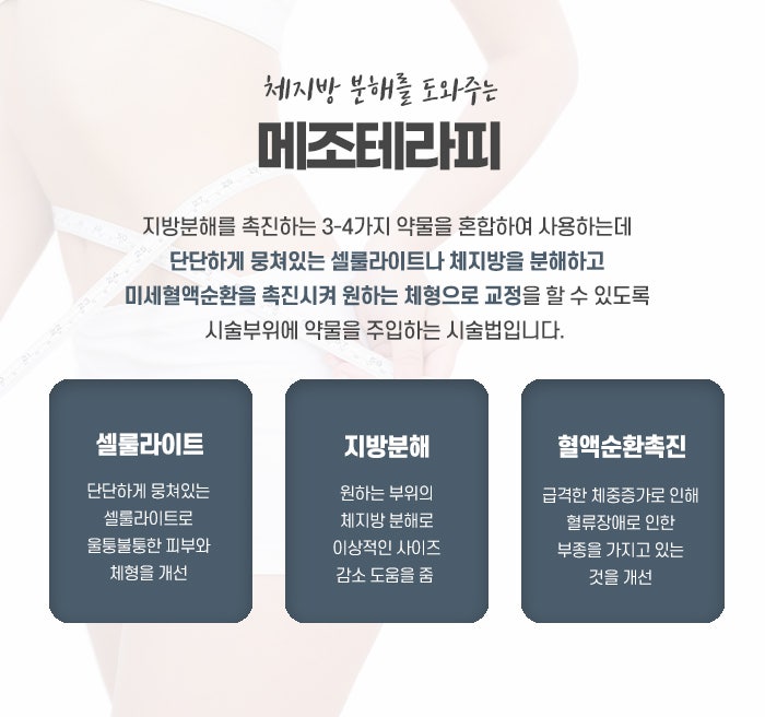 메조테라피는 지방 분해 물질을 피부에 주입하여 지방 세포를 파괴하고, 지방의 분해와 체지방 감소를 유도하는 방법입니다. 이 치료는 비만 뿐만 아니라 셀룰라이트나 피부 탄력 저하에도 도움을 줍니다. 메조테라피는 지방분해 주사를 통해 지방 세포를 파괴하고, 지방을 체내에서 배출하도록 유도하는 구리다이어트 방법입니다. 이 치료는 지방을 분해하는 성분을 피부에 주입하는 방식으로, 주로 카르니틴, 디옥시콜산, 가공된 아미노산 등 다양한 약물을 사용합니다. 주입된 약물은 지방을 직접적으로 분해하며, 이를 통해 비만 부위의 지방층을 줄여 나갑니다. 메조테라피는 지방 분해를 촉진하고 국소적인 비만 부위에 도움을 줍니다. 특히, 팔뚝, 배, 허벅지, 엉덩이 등의 부분에 적용하며 살이 빠지지 않는 부위에서 지방을 타겟으로 하는 데 유용합니다. 치료 후에는 체지방이 감소하고, 피부가 매끄럽고 탄력 있어지며, 체형 개선을 기대할 수 있습니다.