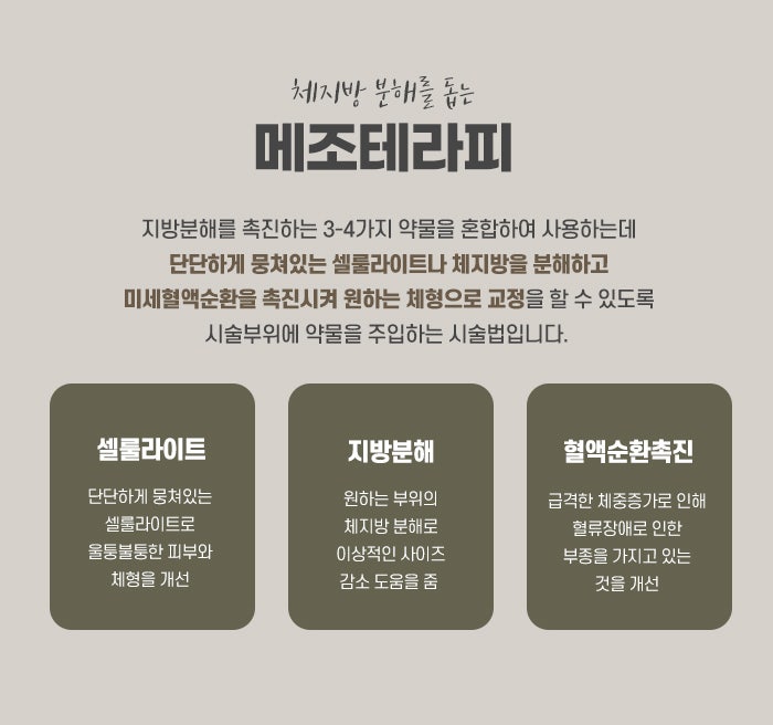 특히 축적된 지방과 셀룰라이트 개선에 도움을 주며, 림프 순환을 도와 노폐물 배출을 원활하게 합니다. 카복시테라피는 지방이 많은 부위에 직접 적용할 수 있어 복부, 허벅지, 엉덩이 등 문제 부위의 지방 감소에 큰 도움을 줍니다. 또한 피부 탄력을 높여 다이어트 후 흔히 발생하는 처진 피부 문제도 개선할 수 있습니다. 시술은 비교적 안전하고 회복 기간이 짧으며, 구리다이어트와 운동을 병행할 때 시너지를 낼 수 있어 많은 사람들이 선택하는 방법입니다. 무엇보다 카복시테라피는 체내 순환 기능을 활성화하여 전신적인 건강 개선에도 긍정적인 영향을 미칩니다. 메조테라피는 미세한 바늘로 지방 분해 물질, 비타민, 미네랄 등을 피부에 직접 주입하는 방법으로 지방 감소와 피부 탄력 증진에 도움을 줍니다. 다이어트 시 특정 부위의 국소 지방이 쉽게 빠지지 않거나 피부 탄력이 떨어지는 경우 메조테라피가 도움이 됩니다.