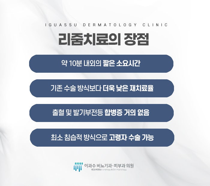 구리비뇨기과 리줌 시술은 전립선 조직에 증기를 주입하여 비대해진 조직을 선택적으로 파괴하는 최소침습적 치료법입니다. 시술 과정에서 전립선 조직을 직접 절제하지 않고, 온수 증기의 열에너지를 이용해 세포를 괴사시키는 방식으로, 주변 신경과 조직 손상을 최소화하면서 전립선 부피를 줄일 수 있습니다. 리줌 시술의 장점은 회복이 빠르고, 전신 마취가 필요하지 않으며, 성기능이나 사정 기능에 대한 부작용이 적다는 점입니다. 기존의 개복 수술이나 전통적 내시경 절제술에 비해 출혈이나 합병증 위험이 낮고, 입원 없이 당일 퇴원이 가능하여 환자의 부담을 크게 줄여줍니다. 시술 후에는 서서히 전립선이 줄어들면서 요도 압박이 완화되어 소변줄이 굵어지고 잔뇨감이 줄어듭니다.