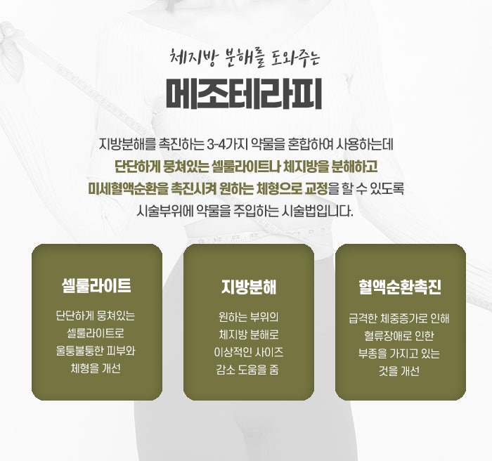 메조테라피는 지방 분해를 촉진하는 약물을 피부 하층에 직접 주입하는 구리다이어트 시술로, 지방세포의 분해와 배출을 돕는 효과가 있습니다. 또한 혈액순환을 개선하고 셀룰라이트를 감소시키며, 피부의 탄력과 윤곽을 동시에 개선할 수 있습니다. 메조테라피는 특히 허벅지, 복부, 팔뚝 등 국소 지방 제거와 라인 조절에 도움을 주며, 기존 식이요법과 운동으로 쉽게 줄지 않는 군살 제거에 도움을 줍니다. 시술 후에는 개인별 체질과 생활습관에 따라 다르지만, 지방층이 점차 감소하며 피부 표면이 매끄럽게 변하는 변화를 느낄 수 있습니다. 카복시와 메조테라피는 단독으로도 도움이 되지만, 올바른 식습관과 규칙적인 운동을 병행할 때 최상의 결과를 얻을 수 있습니다. 식이요법은 균형 잡힌 영양 섭취가 핵심으로, 고단백 저탄수화물 식단, 충분한 채소와 수분 섭취, 당류와 가공식품 제한이 필요합니다.