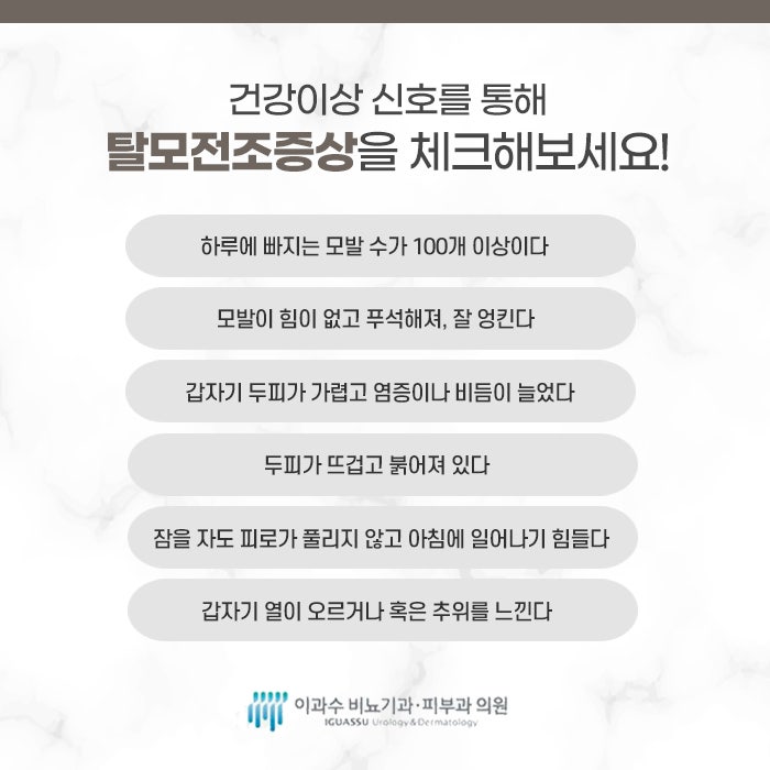 구리탈모의 증상은 개개인에 따라 다를 수 있지만, 대부분의 탈모에는 공통된 특징들이 있습니다. 증상이 점진적으로 진행되는 경우가 많아 초기 단계에서는 크게 눈에 띄지 않기도 합니다. 탈모 초기에는 모발이 점차 가늘어지며, 점점 더 약해지기 시작합니다. 머리카락이 두꺼운 상태에서 점차 얇아지는 경우가 많습니다. 일반적으로 하루에 50~100개의 모발이 빠지는 것은 정상입니다. 그러나 탈모가 시작되면, 빠지는 모발의 수가 증가하고, 이는 눈에 띄게 보일 수 있습니다. 특히, 샤워 중이나 빗질 후 머리카락이 많이 빠지는 것을 느낄 수 있습니다. 탈모가 진행되면서 두피가 가려워지거나 발적이 생길 수 있습니다. 이는 두피에 염증이 생기거나, 피지선이 과도하게 분비되어 모공을 막기 때문입니다.