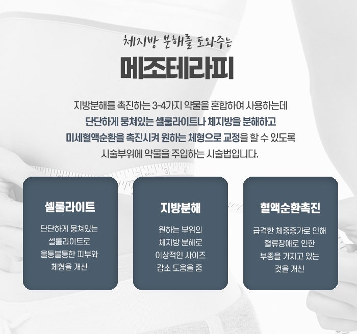또한 카복시테라피는 체내 자연 치유력을 자극하여 전신적인 건강 증진에도 긍정적인 영향을 미칩니다. 메조테라피는 미세한 바늘을 사용해 비타민, 미네랄, 아미노산, 지방 분해제 등을 직접 피부 진피층에 주입하는 방법입니다. 지방 축적이 심하거나 국소 부위의 체형 개선이 필요한 경우에 도움이 되며, 지방세포 분해와 림프 및 혈액 순환 개선을 동시에 도모합니다. 메조테라피는 피부 재생을 촉진하여 남양주다이어트로 인해 탄력이 떨어진 피부를 개선하는 데 큰 도움을 주며, 다양한 약물을 사용할 수 있어 개인 상태에 최적화된 치료가 가능합니다. 복부, 팔, 허벅지, 엉덩이 등 부위별로 적용이 가능하며, 짧은 시술 시간과 빠른 회복으로 바쁜 현대인들에게 적합한 체형관리법입니다. 지방세포를 직접적으로 분해하고 조직 내 독소 배출을 도와 체형 라인을 매끄럽게 만드는 데 좋습니다다.