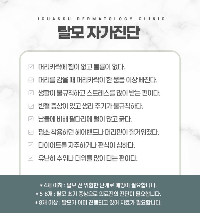탈모는 단기간에 개선할 수 있는 간단한 문제가 아니며 오랜 시간에 걸쳐 서서히 진행되기 때문에 인내와 꾸준함이 필요합니다. 하지만 탈모는 조기에 발견하고 적극적으로 치료하고 관리한다면 충분히 개선될 수 있는 문제이며, 다양한 치료법과 생활 습관 교정을 통해 모발을 되살릴 수 있습니다. 무엇보다 탈모로 인해 좌절하거나 자신감을 잃지 마시고 현재 할 수 있는 것부터 차근차근 실천해보시기 바랍니다. 머리카락은 단지 외형적인 요소일 뿐만 아니라 나 자신을 사랑하고 돌보는 과정을 통해 지켜낼 수 있는 소중한 부분입니다. 탈모로 인해 힘든 시간을 보내고 있다면 너무 혼자 고민하지 마시고 전문가와 함께 해결책을 찾아가시길 바랍니다. 여러분의 변화와 회복을 진심으로 응원하며, 잃어버린 자신감을 다시 찾는 그날까지 늘 곁에서 따뜻하게 응원하겠습니다. 힘내십시오.